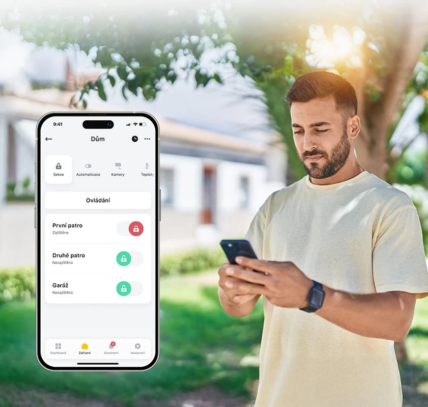 Možnosti zabezpečení rozšiřují kamery. Díky propojení s aplikací MyJABLOTRON máte svůj objekt plně pod kontrolou bez nutnosti neustále sledovat telefon.